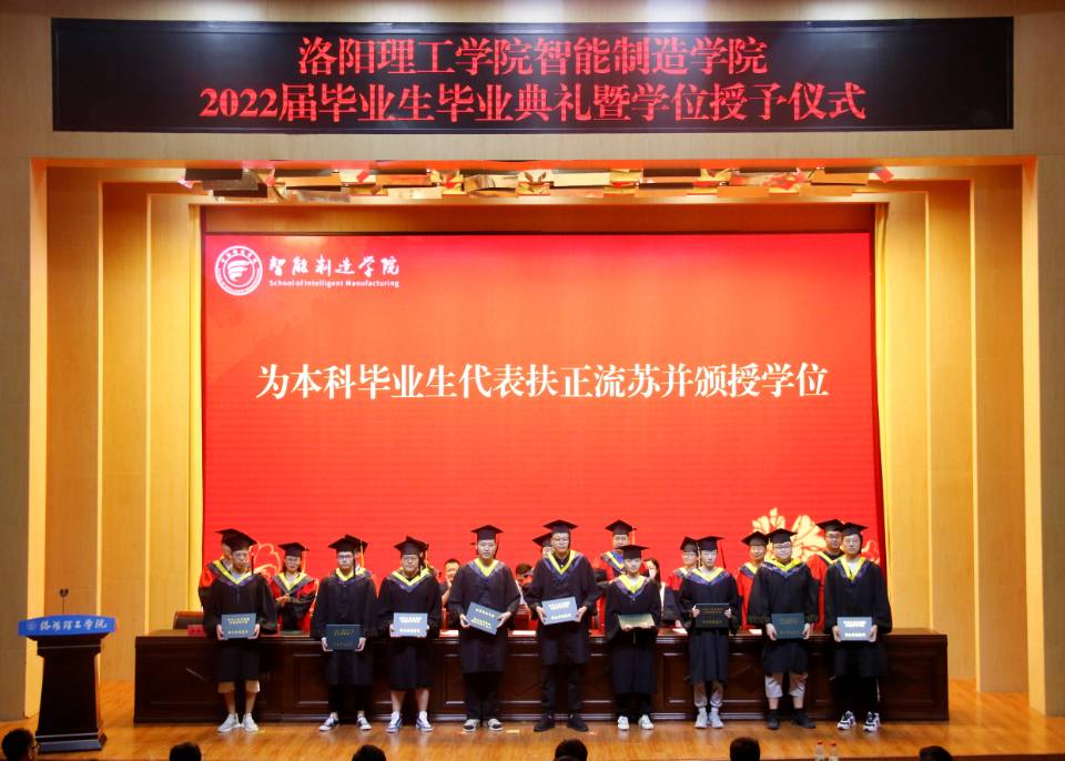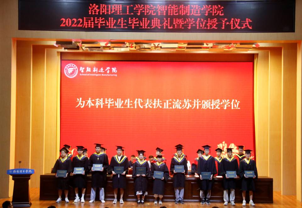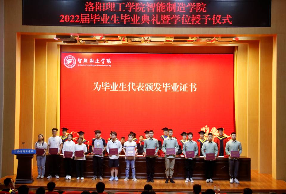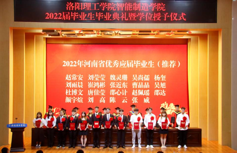 党委书记赵建利宣读《智能制造美高梅娱乐场 2022届优秀毕业生名单》,由参会领导为优秀毕业生代表颁发荣誉证书。