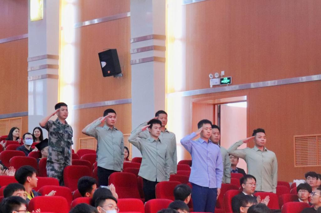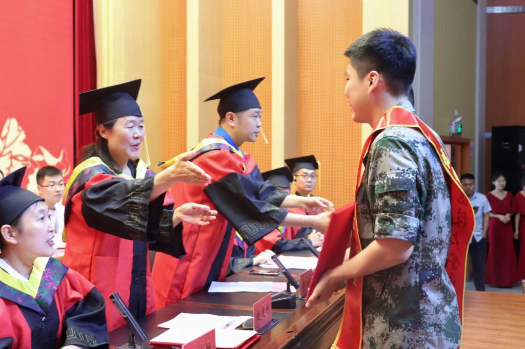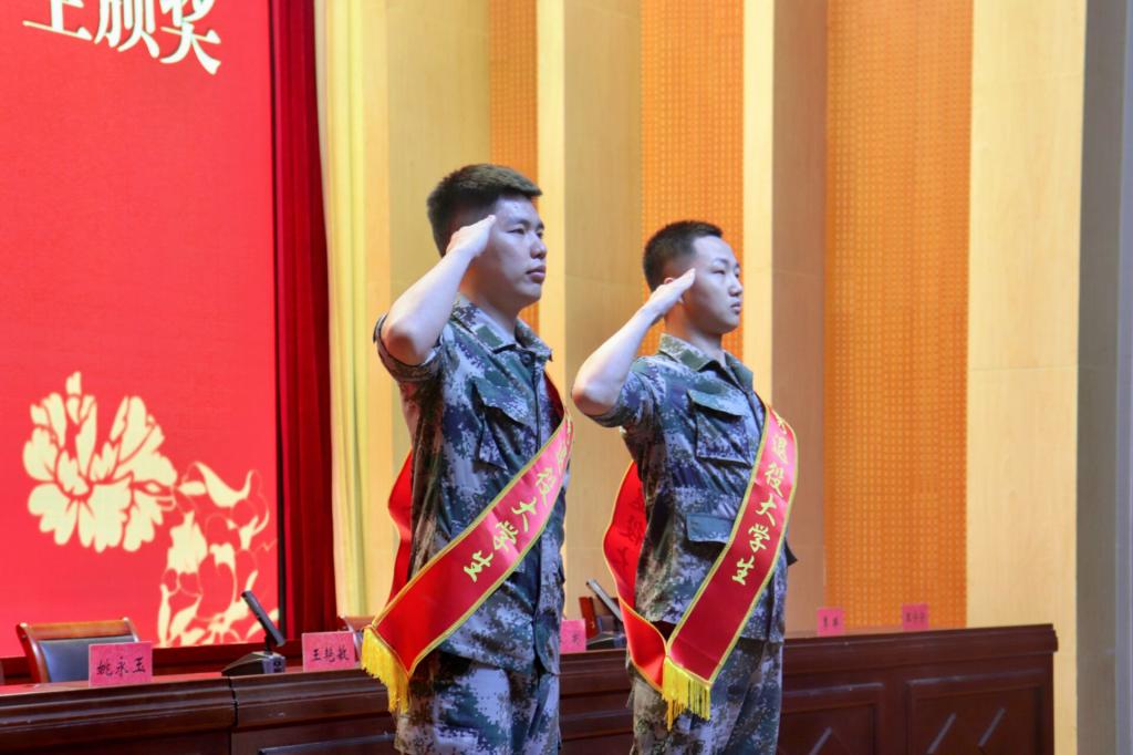 党委书记赵建利、院长李彬为考取硕士研究生的优秀退伍大学生颁发缓带。