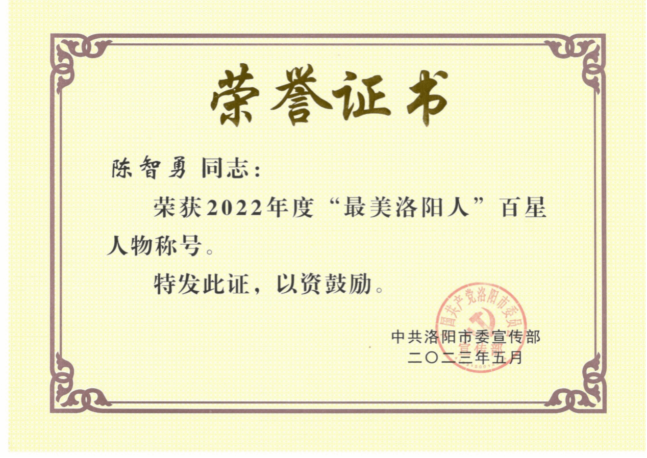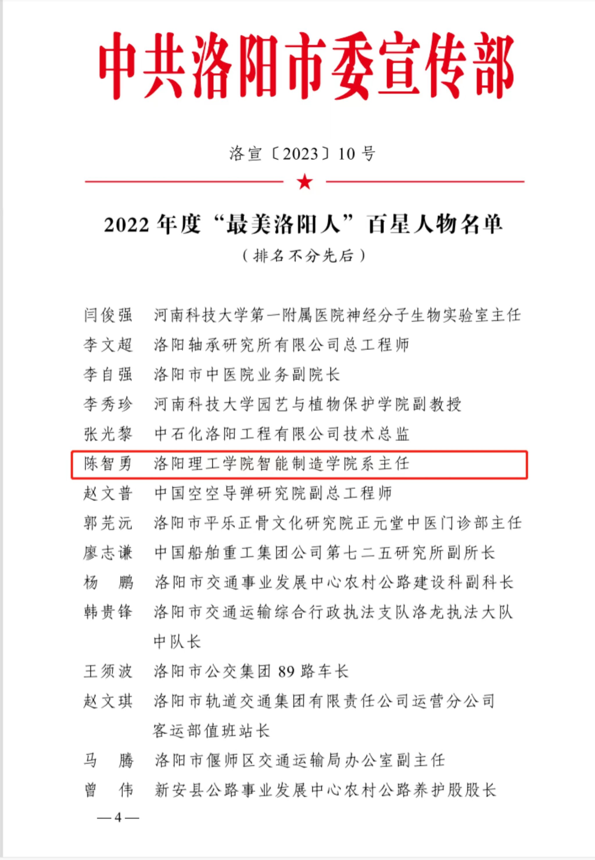 近日,中共洛阳市委宣传部下发了《关于表扬2022年度“最美洛阳人”十佳百星人物的决定》,对2022年度洛阳市“最美洛阳人”十佳人物、“最美洛阳人”百星人物进行表彰。美高梅娱乐场 智能制造美高梅娱乐场 教师陈智勇获“最美洛阳人”百星人物荣誉称号。