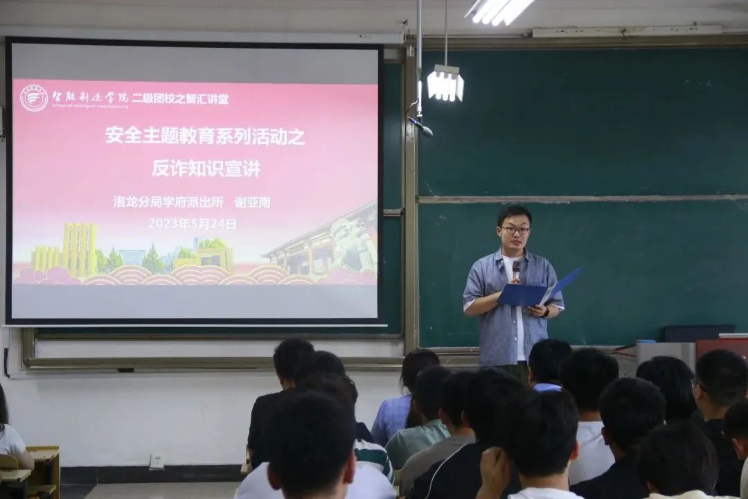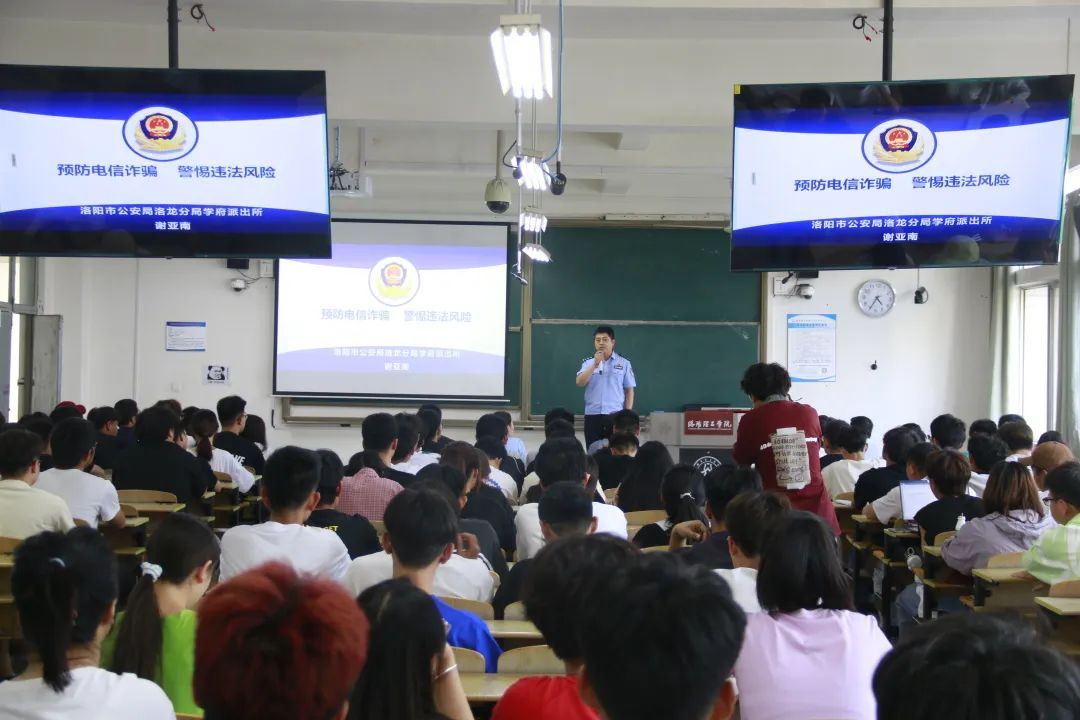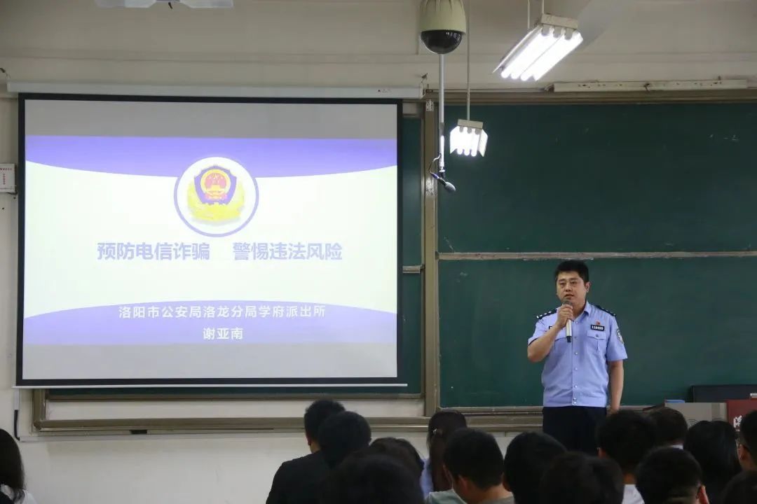 近年来,电信网络诈骗日益猖獗,近期甚至出现使用智能AI技术进行电信诈骗的犯罪新手段,为进一步提高大学生对各类诈骗方式的鉴别能力和自我防范意识,美高梅娱乐场 于2023年5月24日下午在CS401教室召开“安全主题教育系列活动”启动仪式暨首场反诈专题讲座,洛阳市公安局洛龙分局学府街派出所副所长谢亚南、智能制造美高梅娱乐场 党委副书记王艳敏、全体辅导员老师应邀出席,团委学生会全体成员以及入党积极分子共200余人参加。讲座由辅导员张灏老师主持,谢亚南警官主讲。
