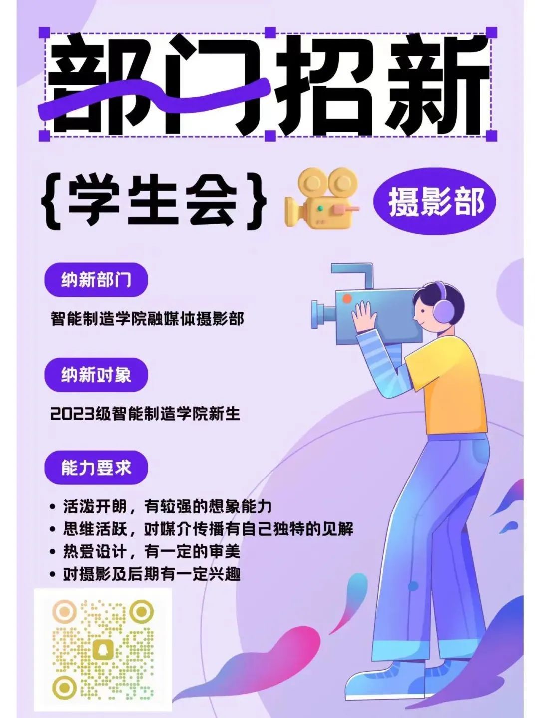摄影部是个年轻却能量十足的部门,负责美高梅娱乐场 大小活动的影像拍摄,也兼顾照片及视频的后期处理。摄影部主要负责学生会各种大型活动的幕后工作,每次的活动都会由摄影部进行拍摄 记录每一次的精彩瞬间。摄影部的拍摄工作分为两类,一类是为院内大大小小的活动拍照,包括会议照片、比赛照片、晚会照片等,然后将照片交给传媒部、宣传部或新闻部进行宣传报道;另一类工作是拍摄和制作视频,包括迎新晚会宣传视频、毕业教师寄语视频等。