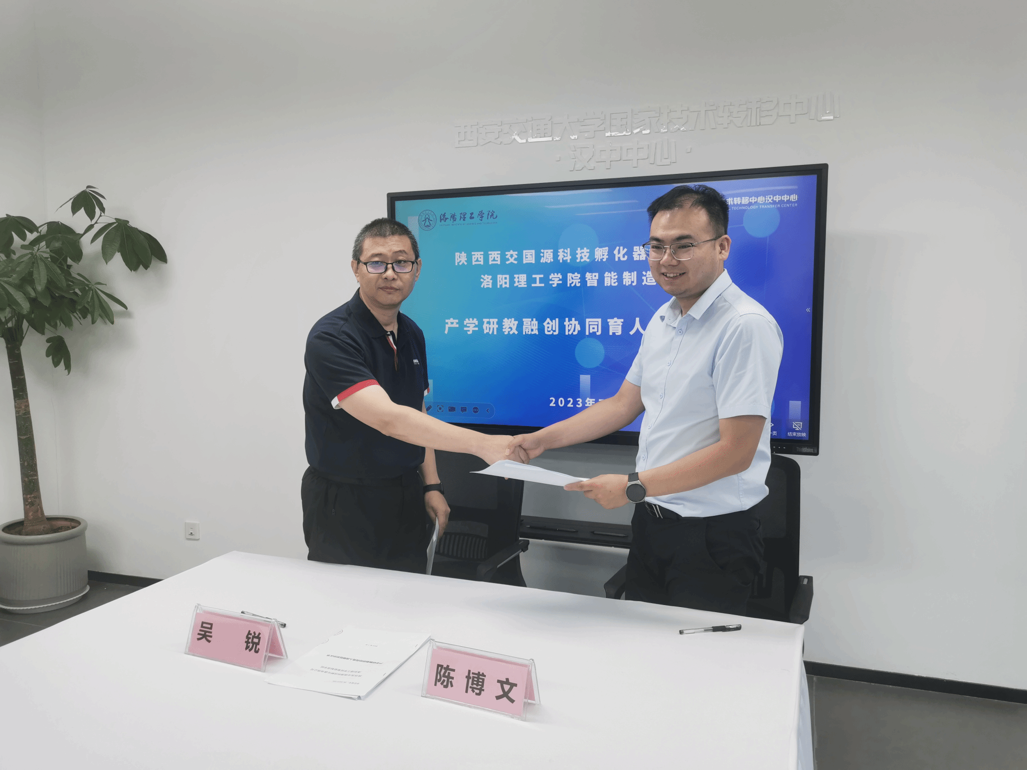 第二站,博士服务团来到了西安交通大学国家技术转移中心汉中中心。该中心搭建的是高校科研和科研成果市场化之间的桥梁。培养了一批职业科技经纪人队伍,遍布在中国多地的38个派出机构。他们走访高校教授,征集可转化科技成果,梳理专利及非专利存量技术。并走访企业,促成科技成果的转化落地,实现产学研链条的完善。通过对技术转移中心的参观和了解,博士服务团与汉中中心最终就产学研合作、产科教融合、协同育人达成了多项共识,签署了深入合作交流的合约。