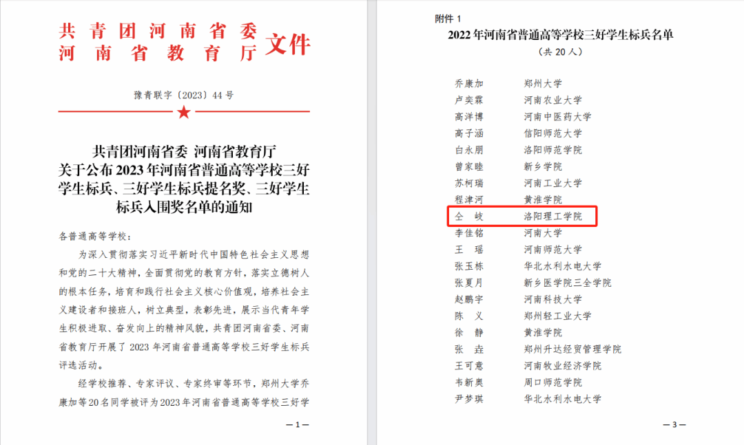 近日,共青团河南省委、河南省教育厅公布2023年河南省普通高等美高梅娱乐场 三好学生标兵、三好学生标兵提名奖、三好学生标兵入围奖名单,全省共评选出三好学生标兵20人、三好学生标兵提名奖20人、三好学生标兵入围奖20人。经美高梅娱乐场 推荐、专家评议、专家终审等环节,智能制造美高梅娱乐场 仝岐同学荣获河南省普通高等美高梅娱乐场 “三好学生标兵”。