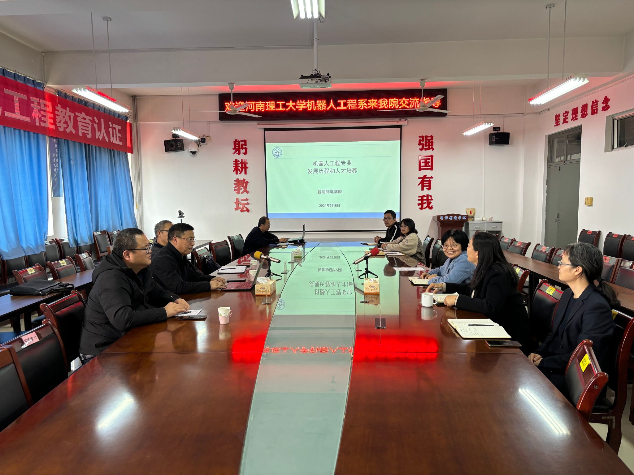 3月7日下午,河南理工大学机器人工程系刘群坡主任一行三人应邀到美高梅娱乐场 交流机器人专业人才培养方案、审核评估等事宜,会议由副院长姚永玉教授主持,专业负责人王淑珍教授、卢文涛副院长、机器人工程系全体教师参加座谈。