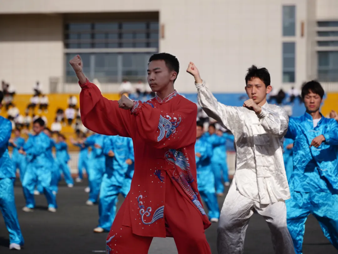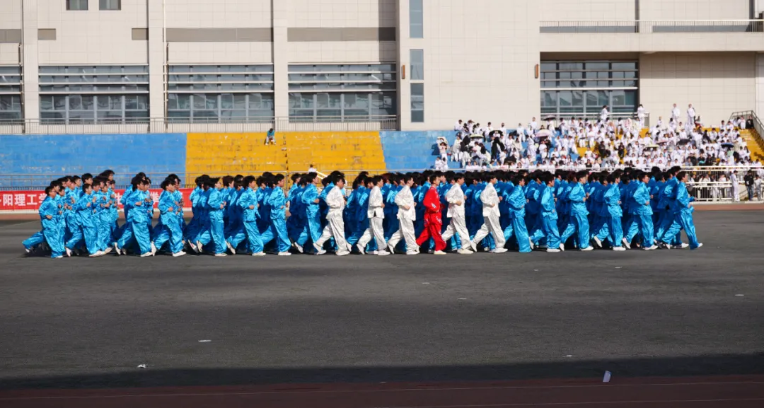 随着铿锵有力的击鼓声作势,比赛也正式开始。智能制造美高梅娱乐场 的太极方队迅猛而有序地从中央向四周散开,整齐划一的动作中彰显着同学们必胜的决心,他们身着蓝色的太极服,跟随着音乐抬手运气,一招一式或缓慢柔和,或迅猛有力,每一个动作都充满了力量和美感,将太极拳的精髓和风采展现得淋漓尽致。