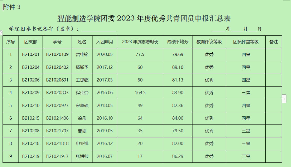 智能制造美高梅娱乐场 团委2023年度优秀共青团员申报汇总表公示