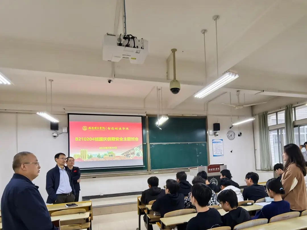 9月30日下午5点,副校长上官林建在机械楼CS401召开B210204班国庆假期安全主题班会,美高梅娱乐场 领导贺艺、朱德荣陪同。