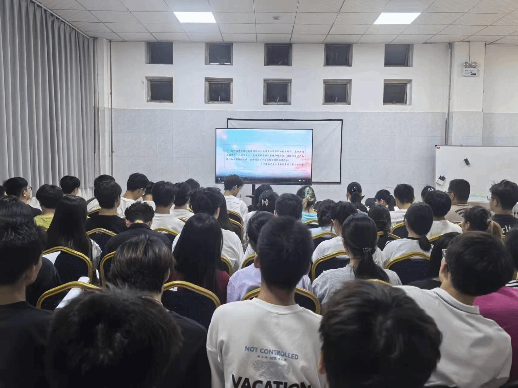 随后,纪律学习环节成为团课重点,课堂通过播放精心选取的《中国共产主义青年团纪律处分条例》解读视频,以生动案例和权威讲解,对条例中的处分种类、纪律审查程序等核心内容进行深度剖析。