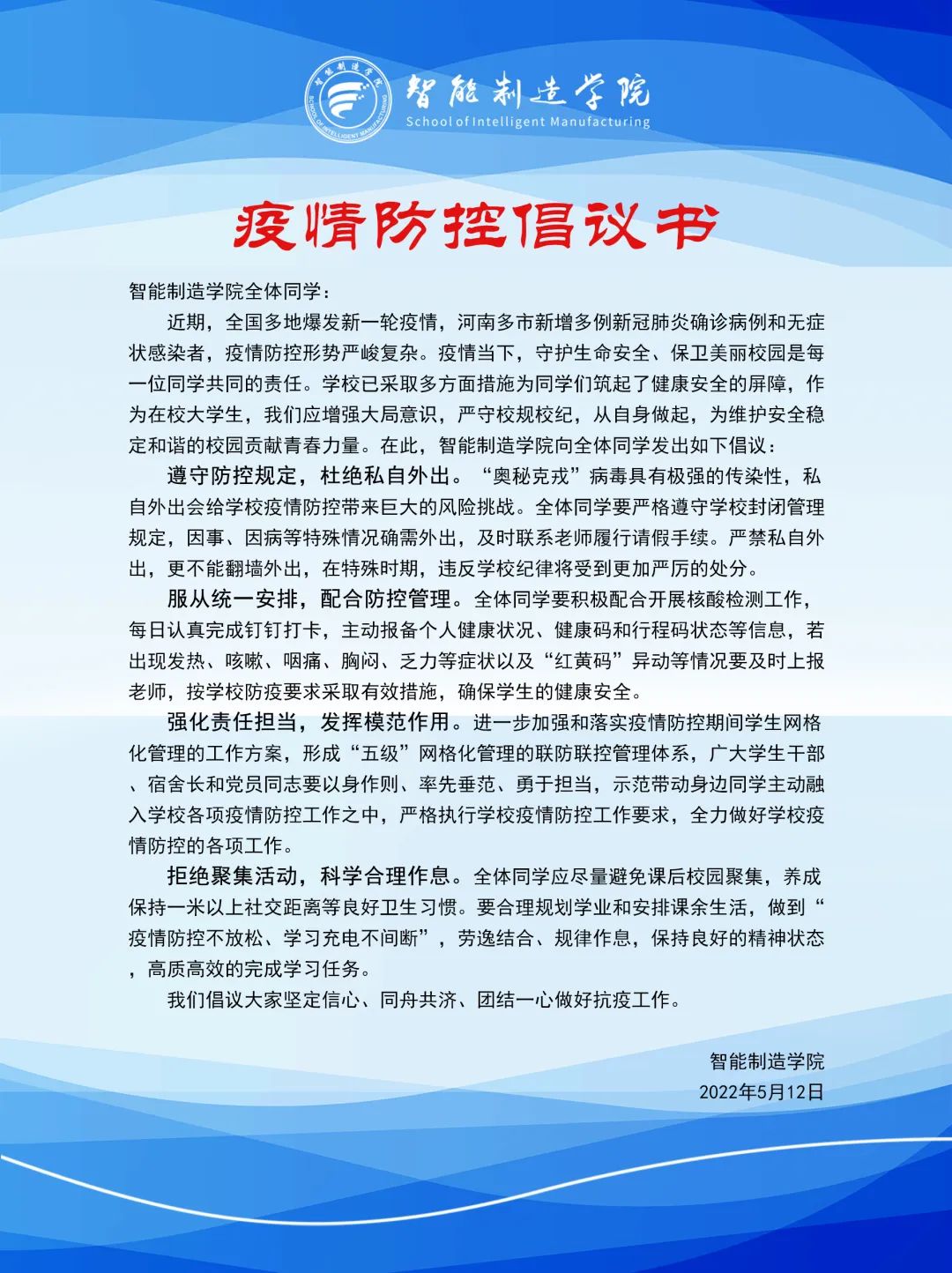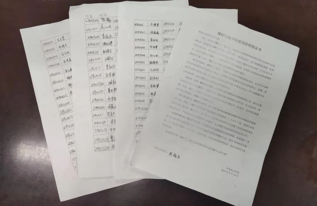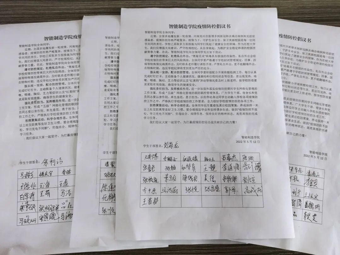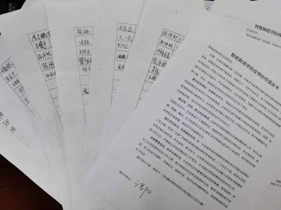 最后,全体老师集中签署了《智能制造美高梅娱乐场 疫情防控倡议书》,向全体同学发出如下倡议:遵守防控规定,杜绝私自外出;服从统一安排,配合防控管理;强化责任担当,发挥模范作用;拒绝聚集活动,科学合理作息。随后,2018-2021级全体团支书纷纷响应号召签下了自己的名字。