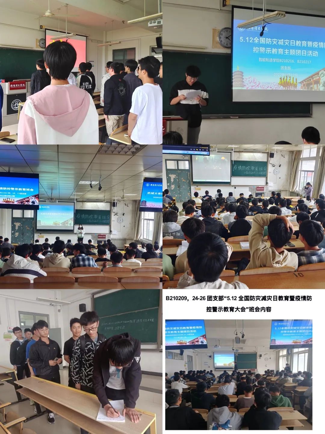 杨超烽老师在CS403教室组织其专业学生召开全国防灾减灾教育暨疫情防控警示教育主题班会,为大家宣传防灾减灾知识,并介绍河南郑州高校疫情的基本情况和本校相关同学因违反校园疫情防控政策,希望同学们引以为戒,立足大局。会议最后由团支部书记宣读校园疫情防控倡议书,所有同学在倡议书上签字。