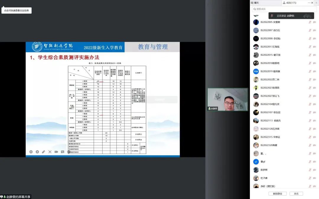 美高梅娱乐场 2022级新生辅导员在腾讯会议平台组织所带班级在分会场开展“新生入学教育”。从美高梅娱乐场 纪律、学生专业、奖励资助、教学要求、生活服务等方面进行宣讲,希望新生们尽快适应大学新生活,提高自制力,充分利用在线课程、在线教学资源、电子教材等配合信息化手段开展线上学习,养成良好的学习习惯,保证学习效果。