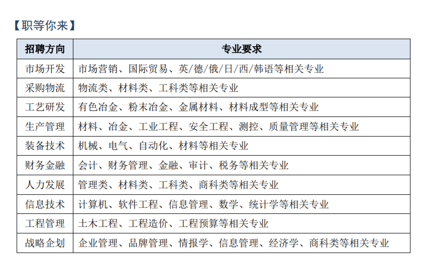 【招聘岗位】市场开发、采购物流、信息技术、战略企划、生产管理、工艺技术、智能制造。