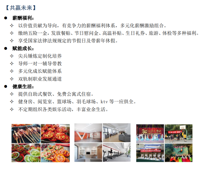【薪资福利】入职即缴纳五险一金、免费公寓式住宿、餐补、通讯补贴、免费旅游、体检等福利