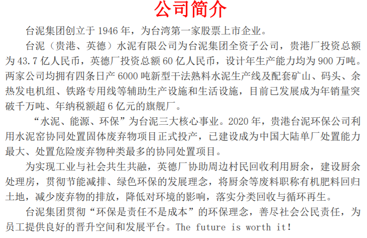 台泥集团(广东英德厂、广西贵港厂)2022届秋季校招宣讲会: