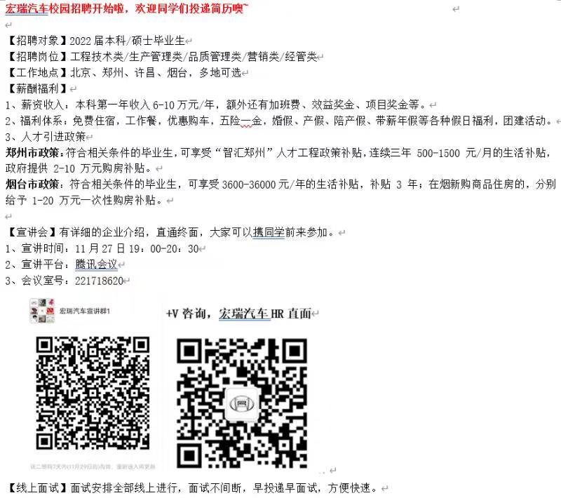 宏瑞汽车以“造低碳汽车、创高品质生活”为使命,秉持“极简极致”造车理念,拥有核心技术自主知识产权,集新能源汽车整车及核心零部件研发、制造、销售业务为一体,以实现“让人人拥有低碳汽车”为愿景,为培育青年才俊,制定“雄鹰计划”对新毕业大学生进行系统培训,促进青年员工快速成长。