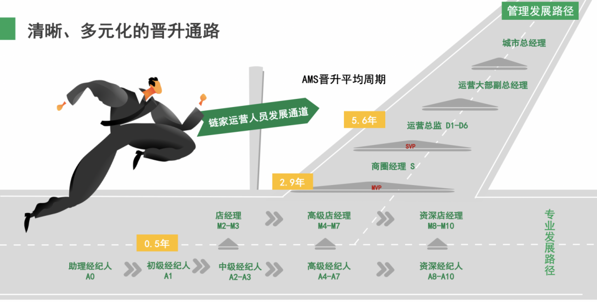 2. 经纪人可以选择在经纪人岗的专家路线 或 管理路线 进行发展,符合条件的员工也可向职能路线转岗机会,如转岗到招聘、培训、美高梅娱乐场等职能部门