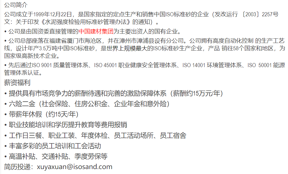 厦门艾思欧标准砂有限公司招聘信息
