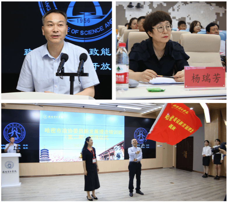 校党委副书记、工会主席曾涛(左上)致辞,哈密市政协副主席杨瑞芳(右上)讲话,副校长韩洪涛(下中)向此次培训班授旗