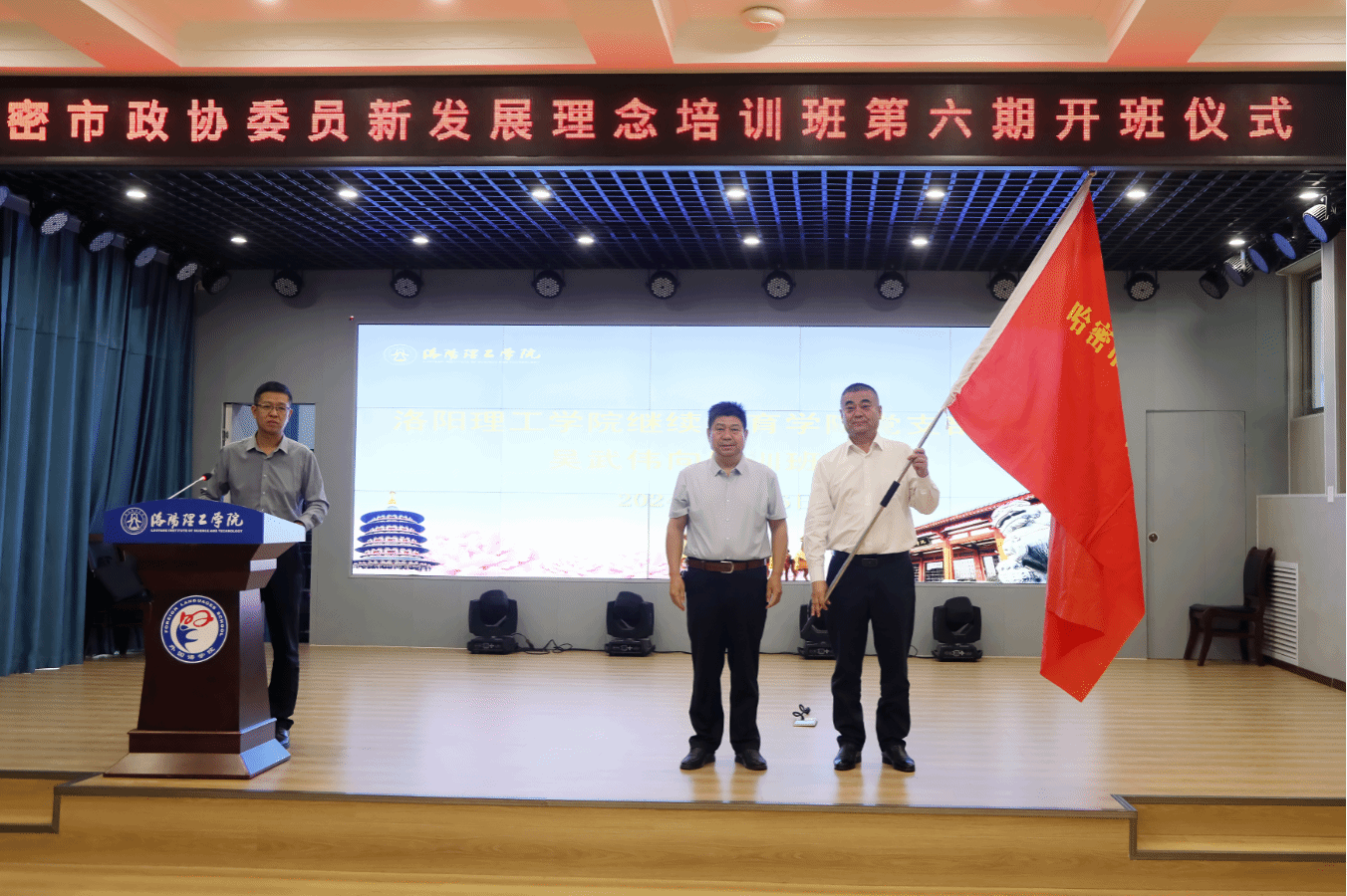 向培训班代表哈密市政协委员、伊州区政协党组书记、主席艾尼瓦尔·亚合甫同志授旗。