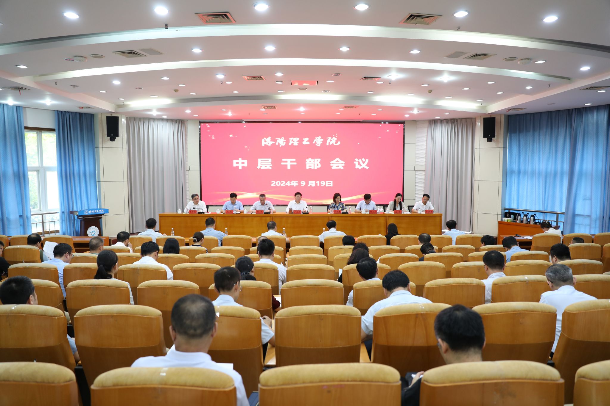 在王城校区办公楼二楼报告厅召开中层干部会议。校领导卢志文、丁梧秀、曾涛、胡恩立、刘楠、马珺、王新武、上官林建出席会议,各职能部门负责人、二级单位党政主要负责人参加会议。会议由党委副书记、工会主席曾涛主持。