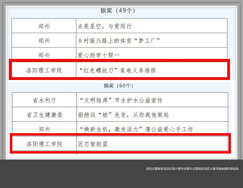 项目《匠芯智能蓝》分别获得第六届中国青年志愿服务大赛省赛金、银、铜奖。