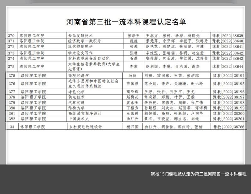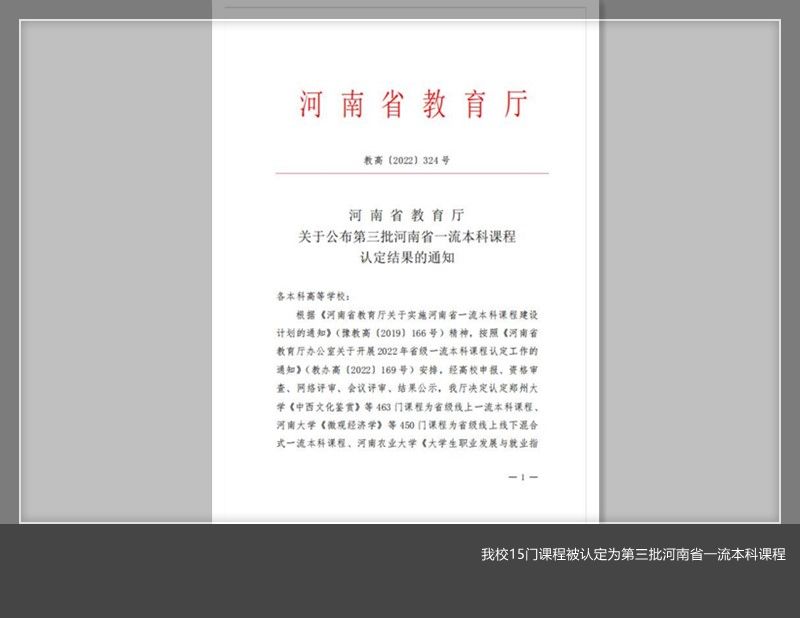 近日,河南省教育厅公布《河南省教育厅关于公布第三批河南省一流本科课程认定结果的通知》(教高〔2022〕324 号)文件,美高梅娱乐场
